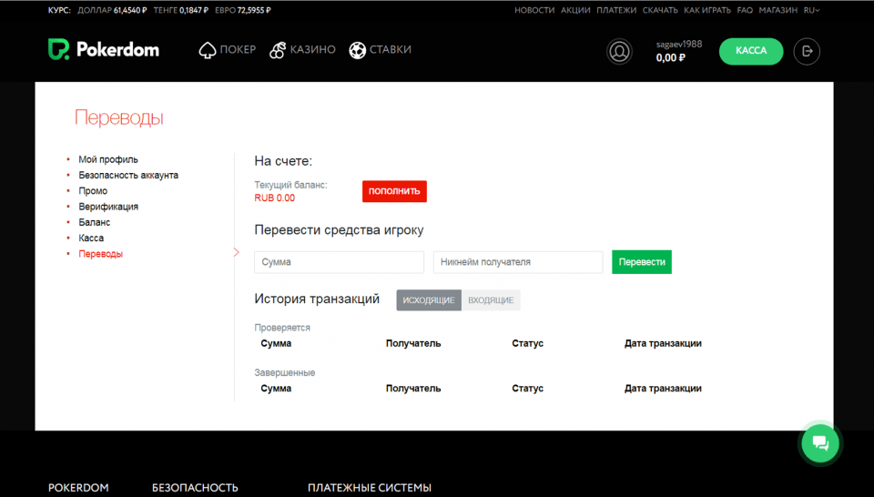 • Переводы. В ПокерДом действует услуга денежных переводов между клиентами комнаты. Все действия можно осуществить, посетив данный блок. Для отправки перевода следует указать ник получателя и сумму. Средства, полученные переводом позволяется использовать только для ставок, кэш-ауту они не подлежат.